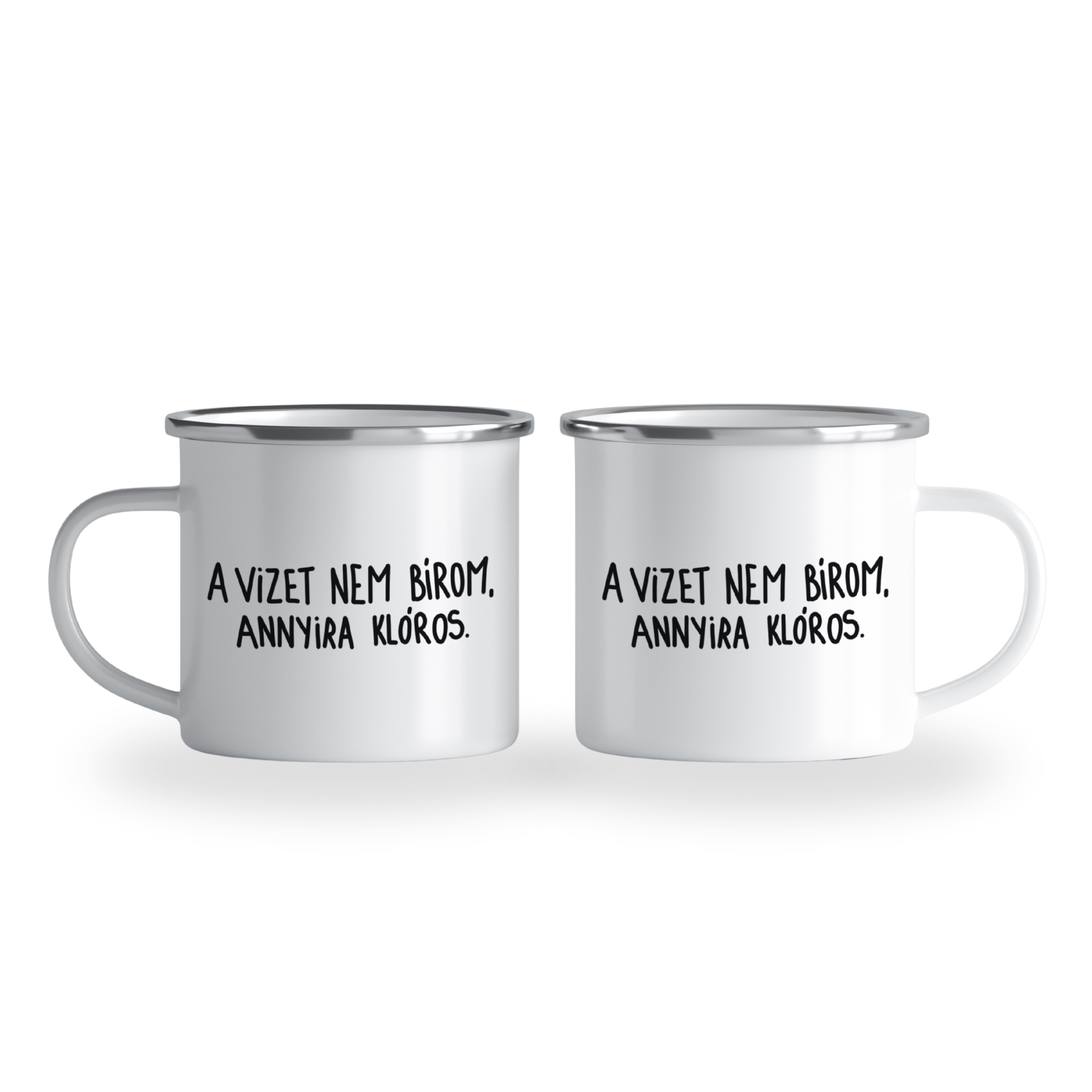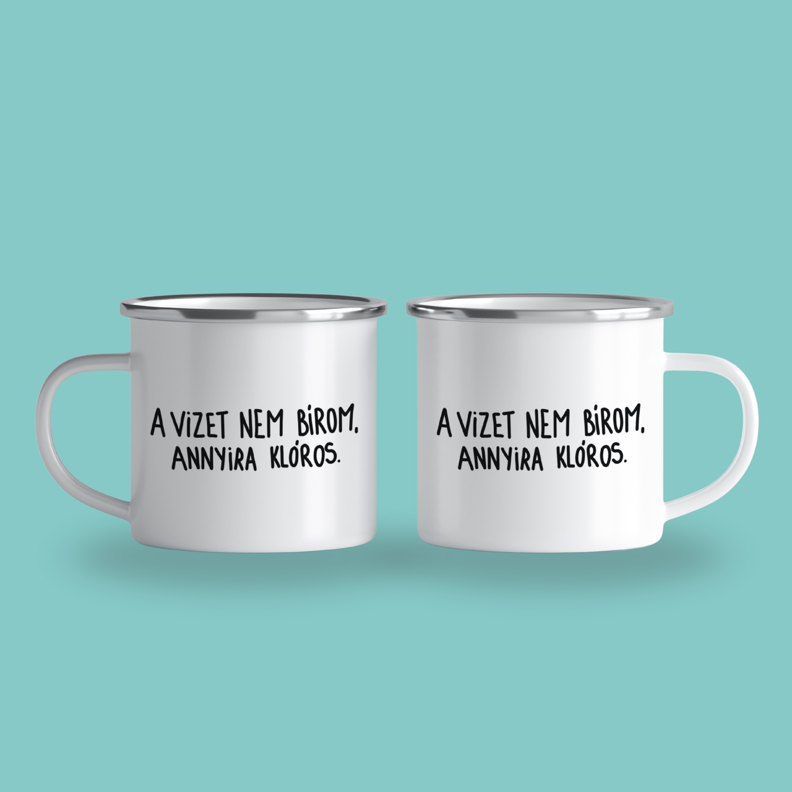 Cană emailată „A vizet nem bírom, annyira klóros”, alb, ibrik, 360 ml