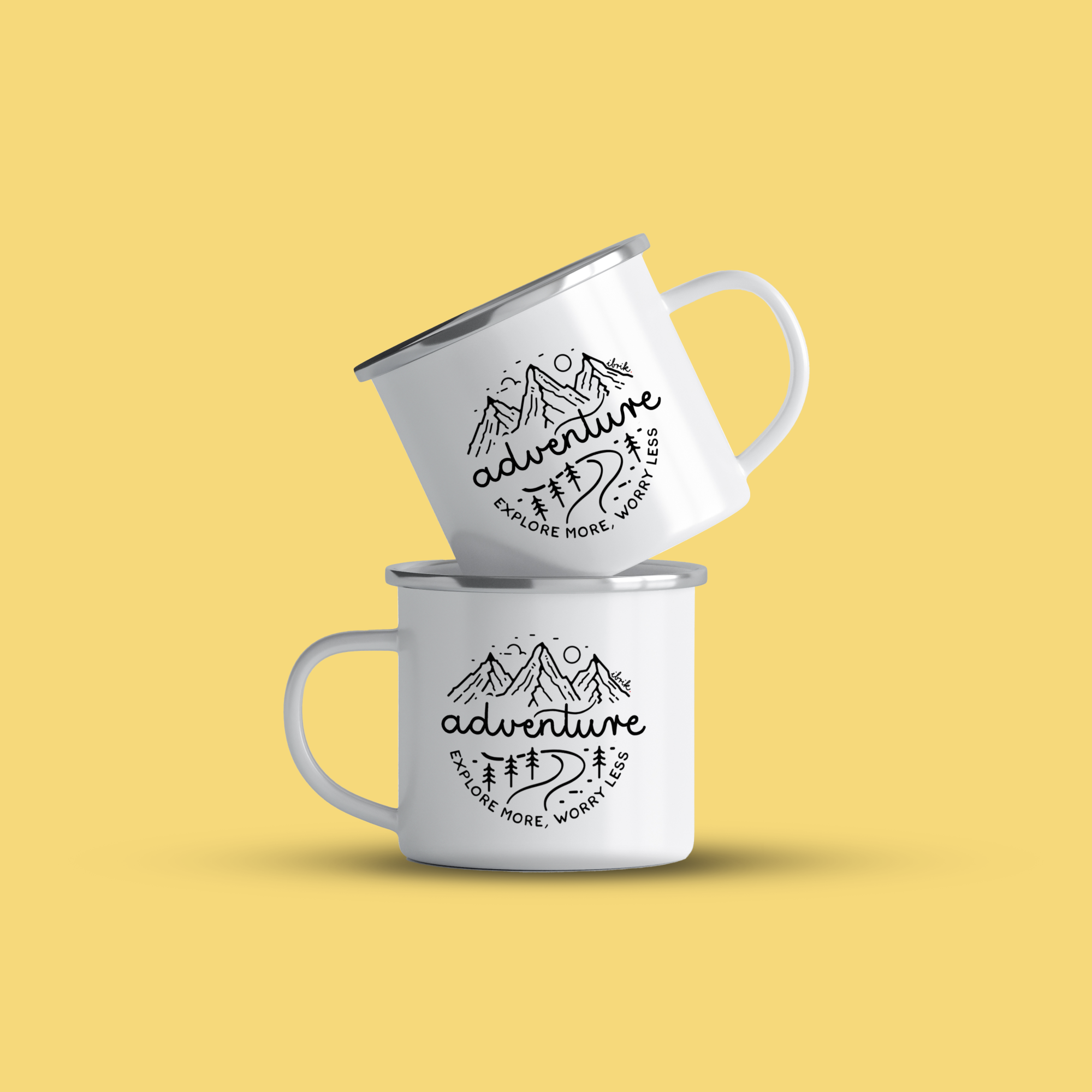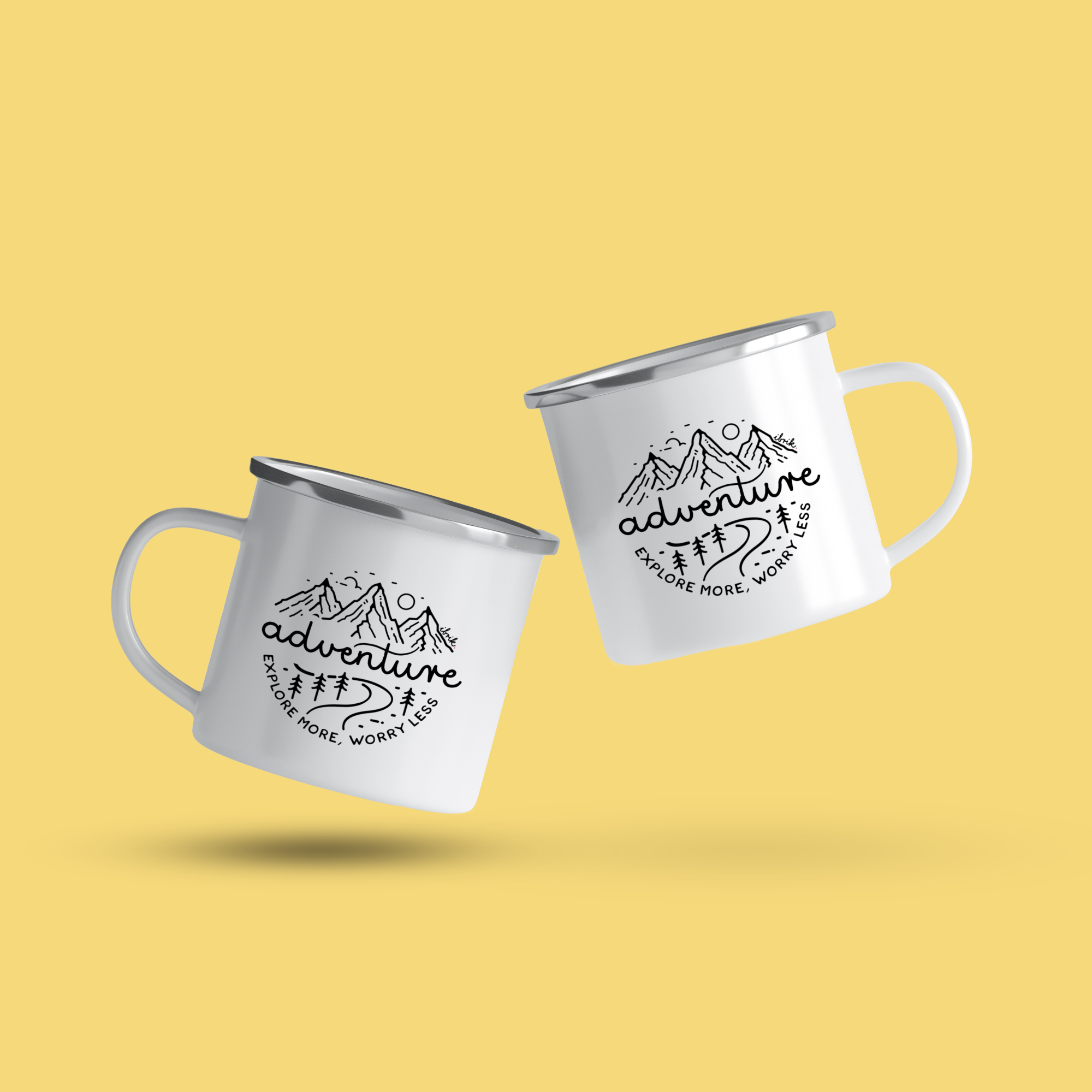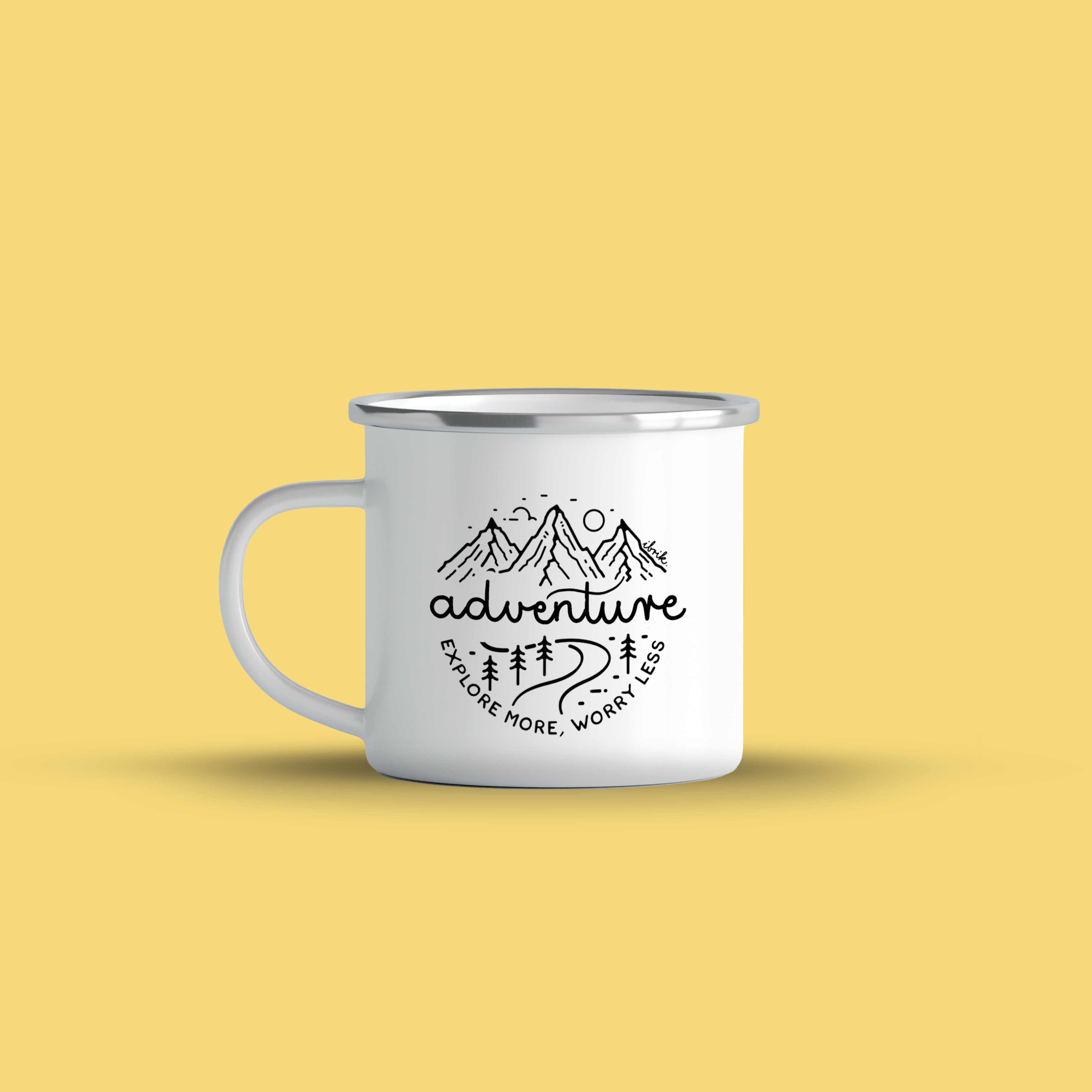 Cană emailată Adventure – worry less, alb, ibrik, 360 ml