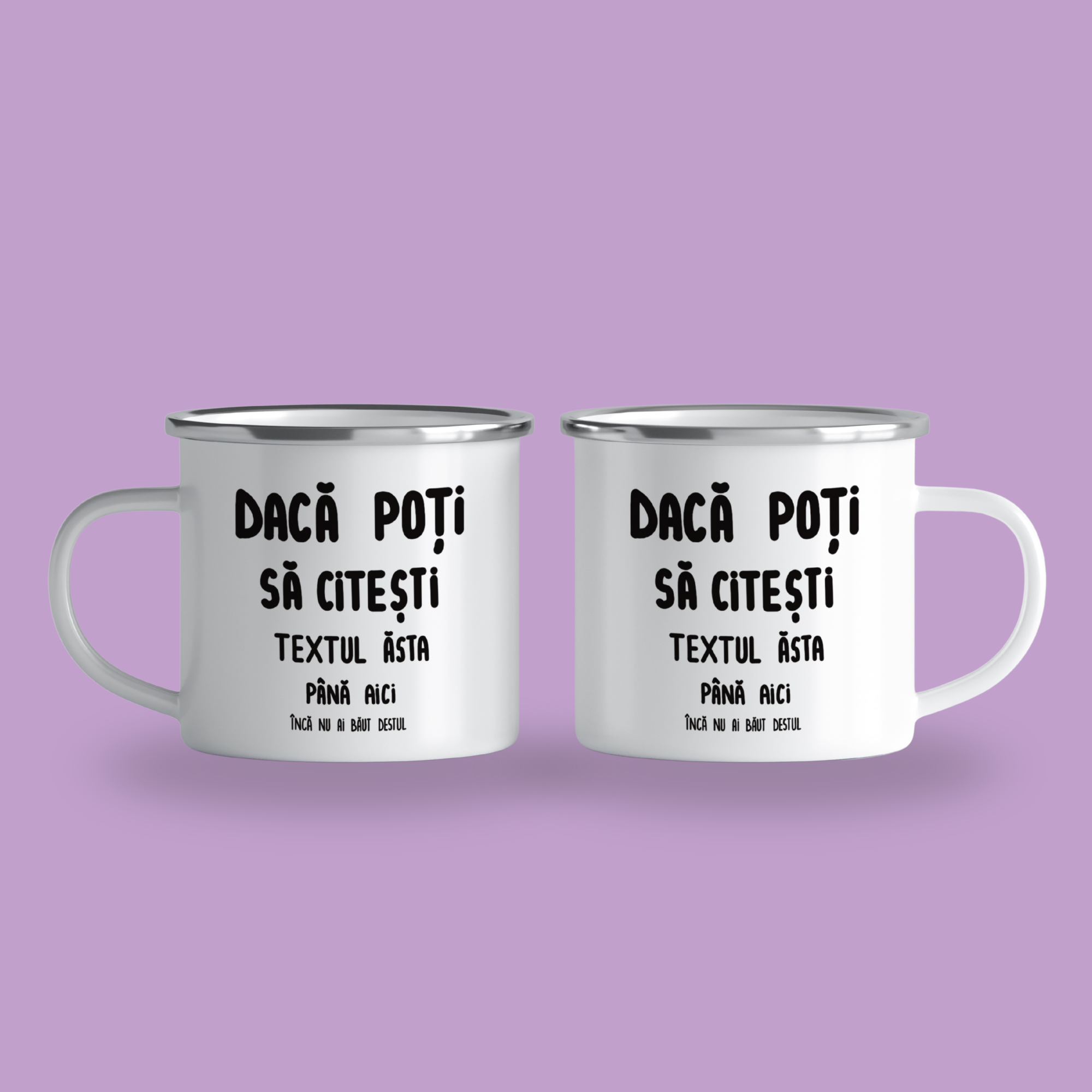 Cană emailată „Dacă poți să citești… destul”, alb, ibrik, 360 ml