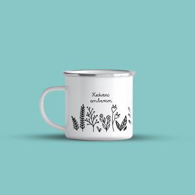Cană emailată de calitate cu o capacitate de 360 ml. Grafica este unică si desenată manual.
