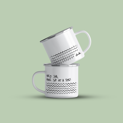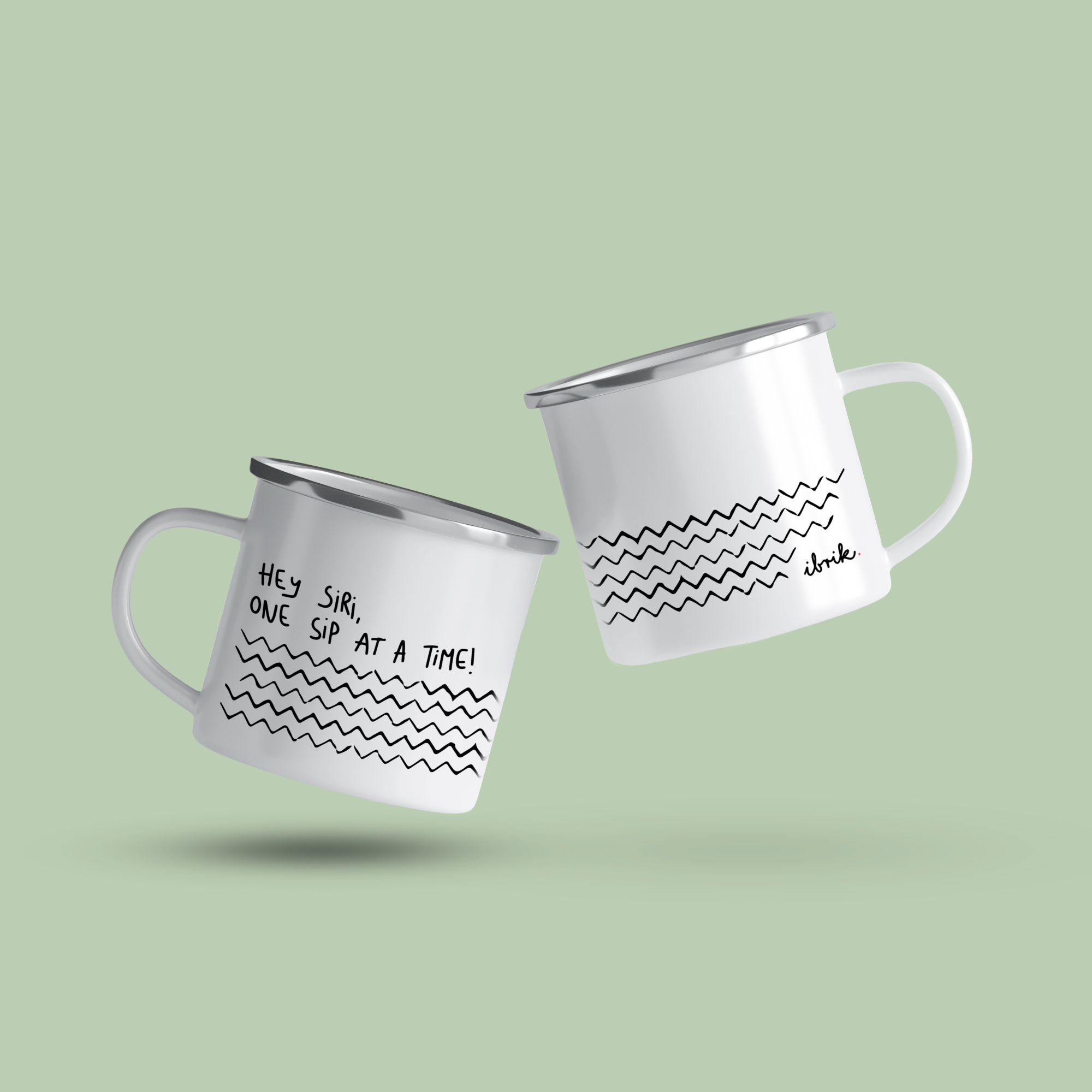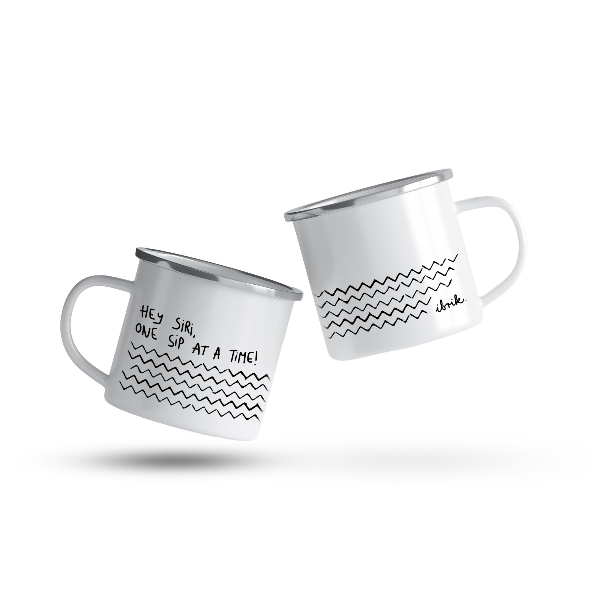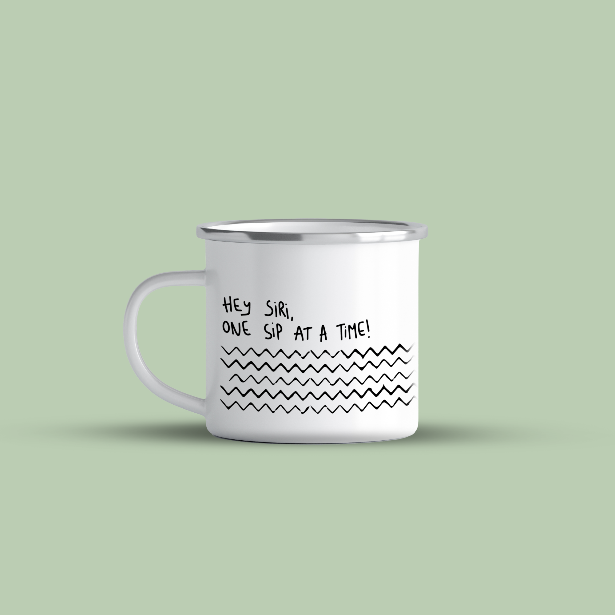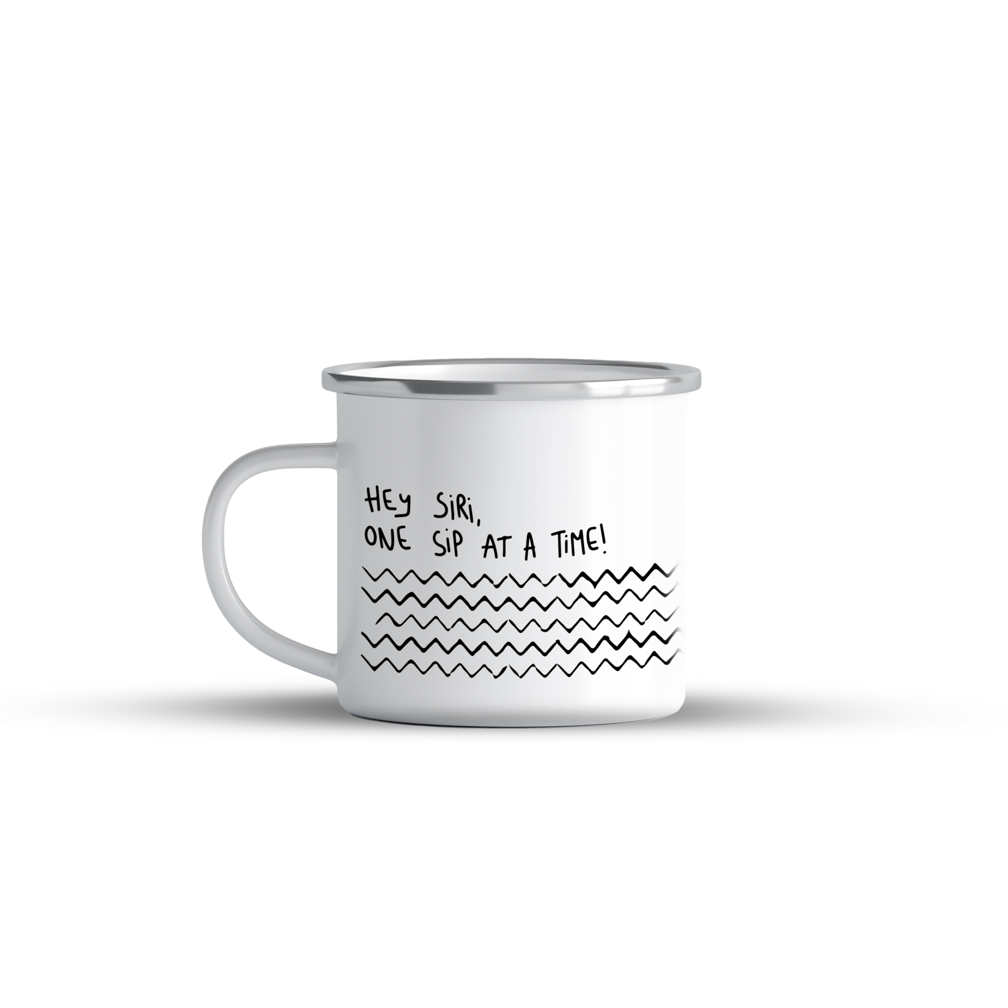 Cană emailată 'Hey Siri, one sip at a time', alb, ibrik, 360 ml