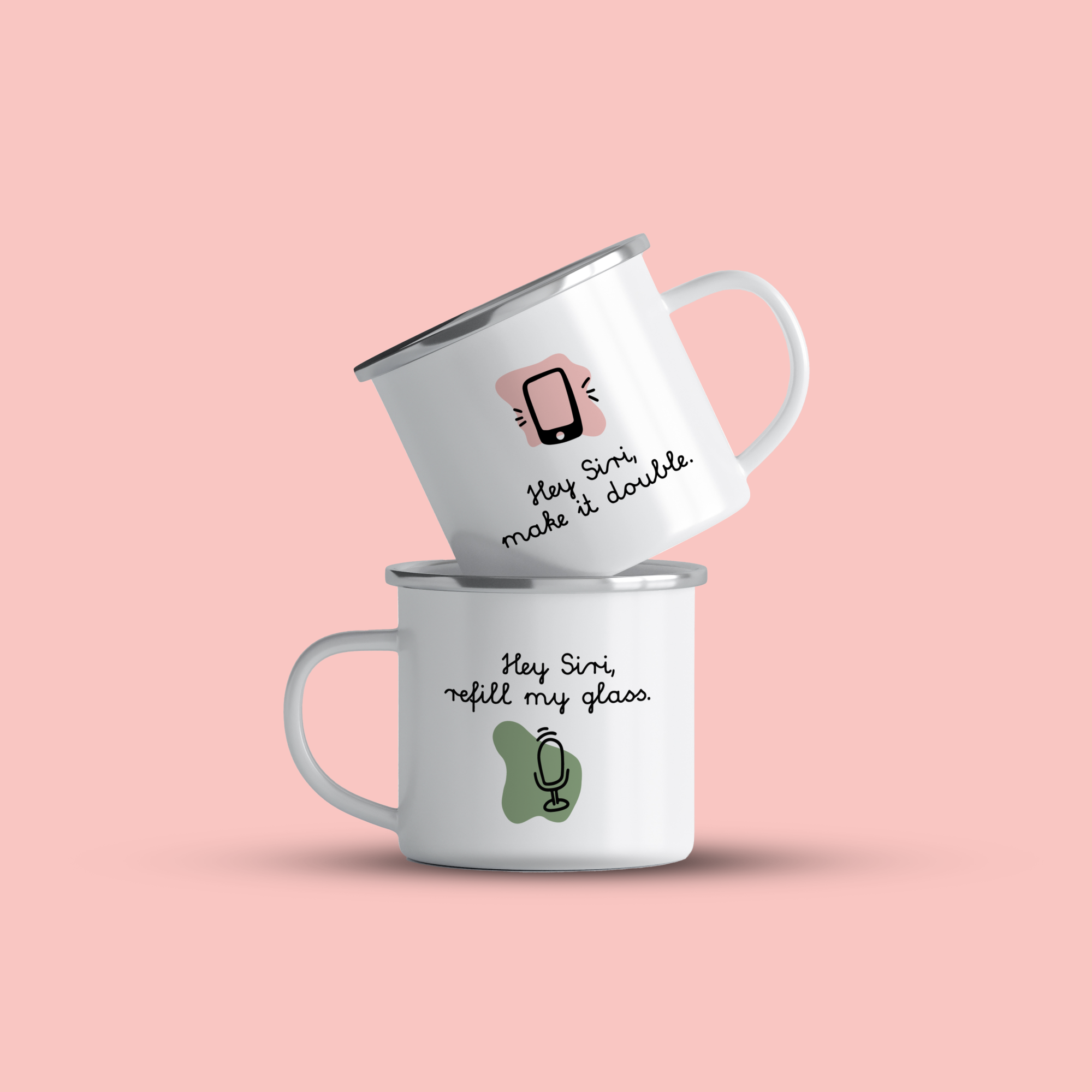Cană emailată ‘Hey Siri, refill my glass’, alb, ibrik, 360 ml