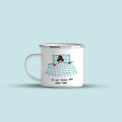 Cană emailată I’m not feeling very worky, alb, ibrik, 360 ml