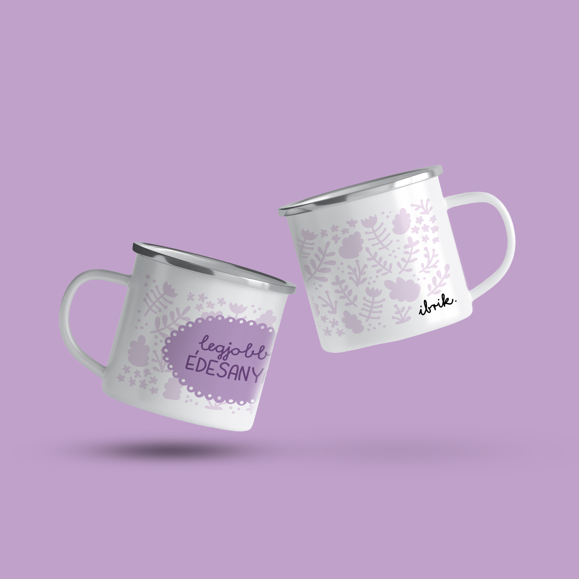 Cană emailată „Legjobb édesanya” lila, alb, ibrik, 360 ml
