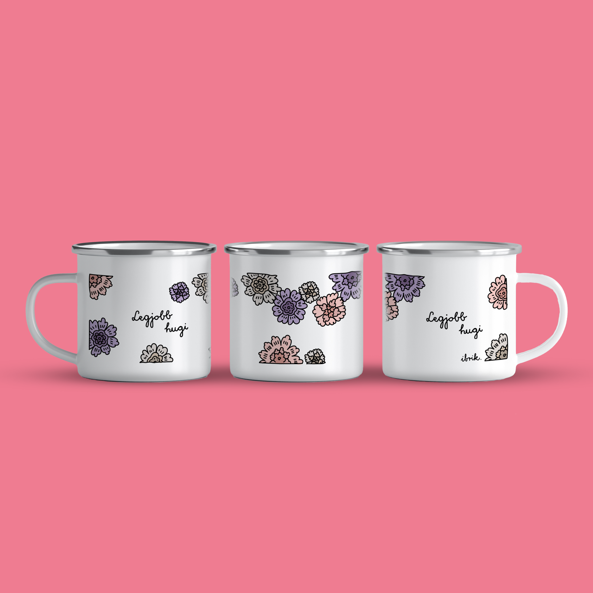 Cană emailată „Legjobb hugi” mandalavirág, alb, ibrik, 360 ml