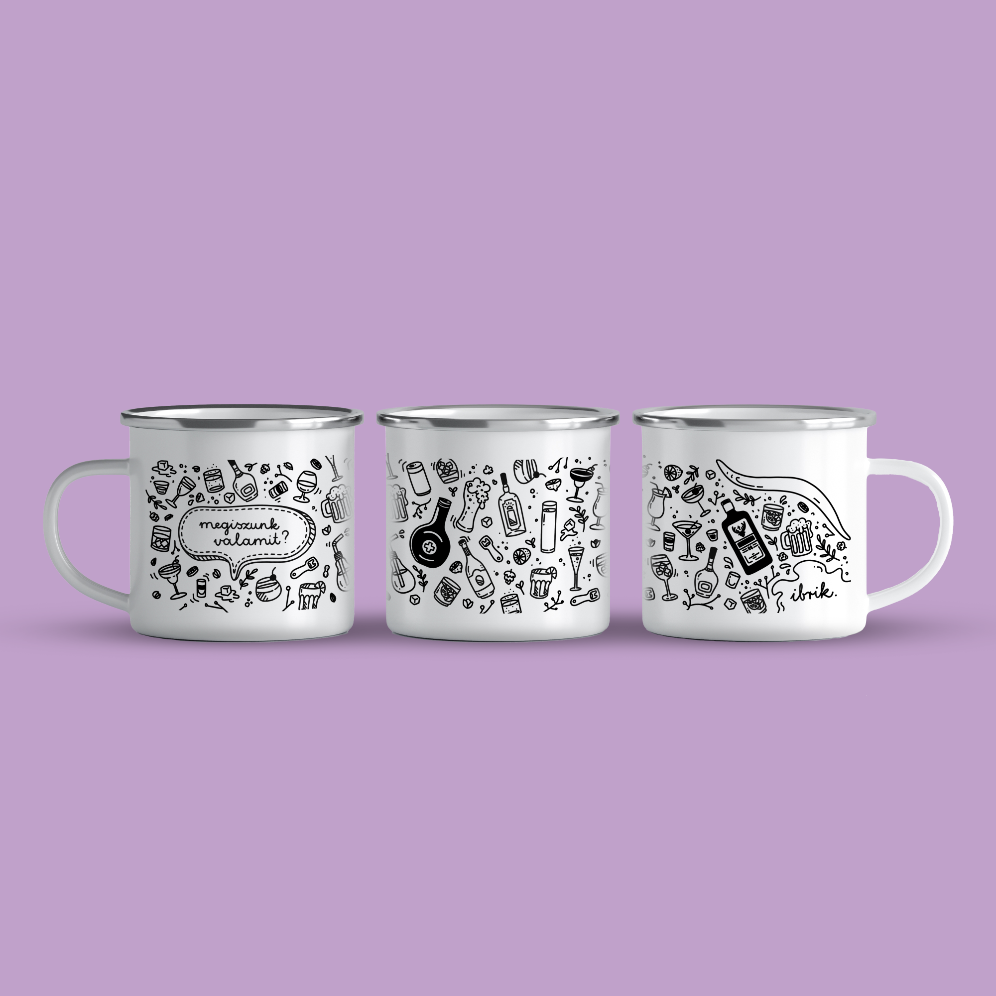 Cană emailată „Megiszunk valamit?” BW, alb, ibrik, 360 ml