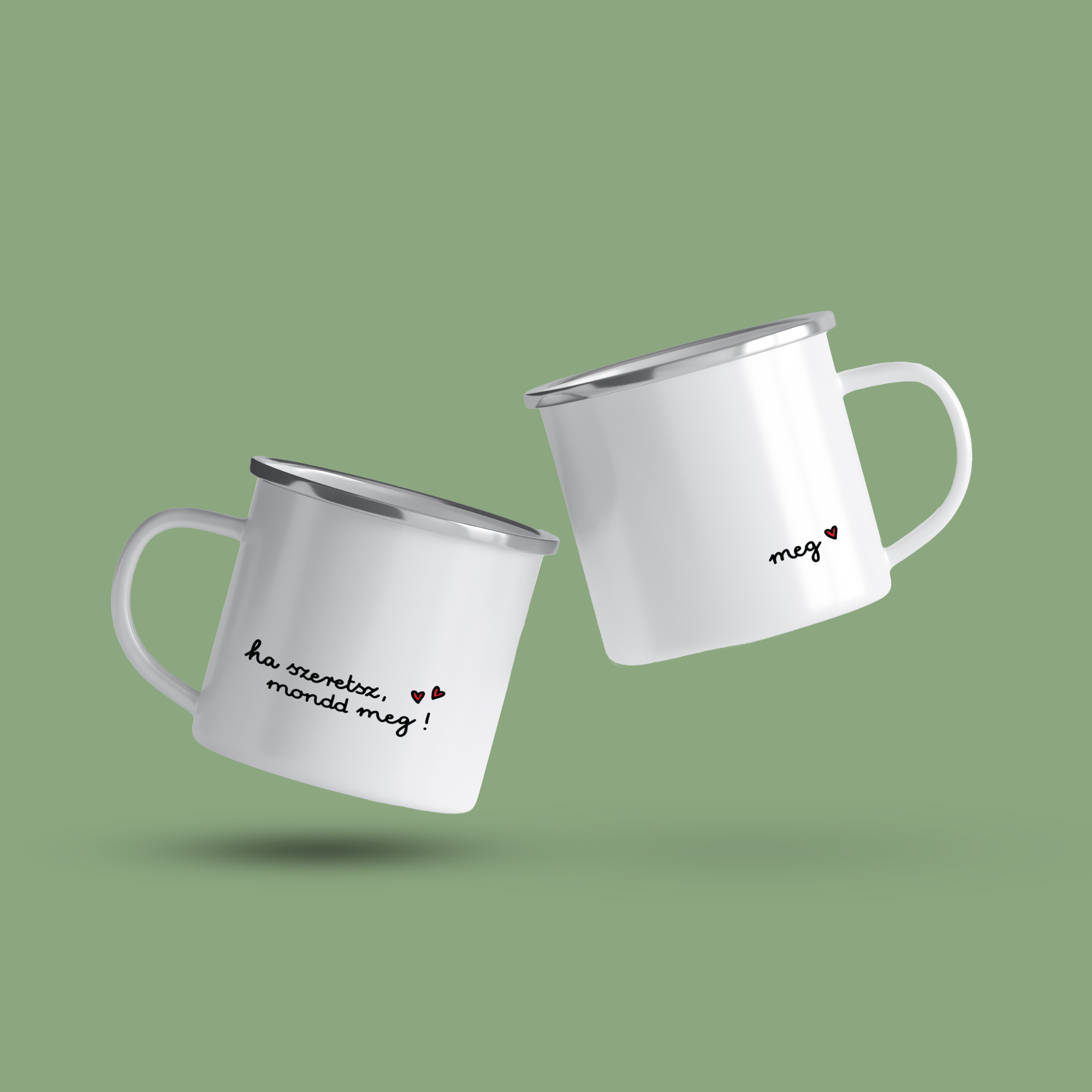 Cană emailată „Mondd meg” – piros szívvel, alb, ibrik, 360 ml