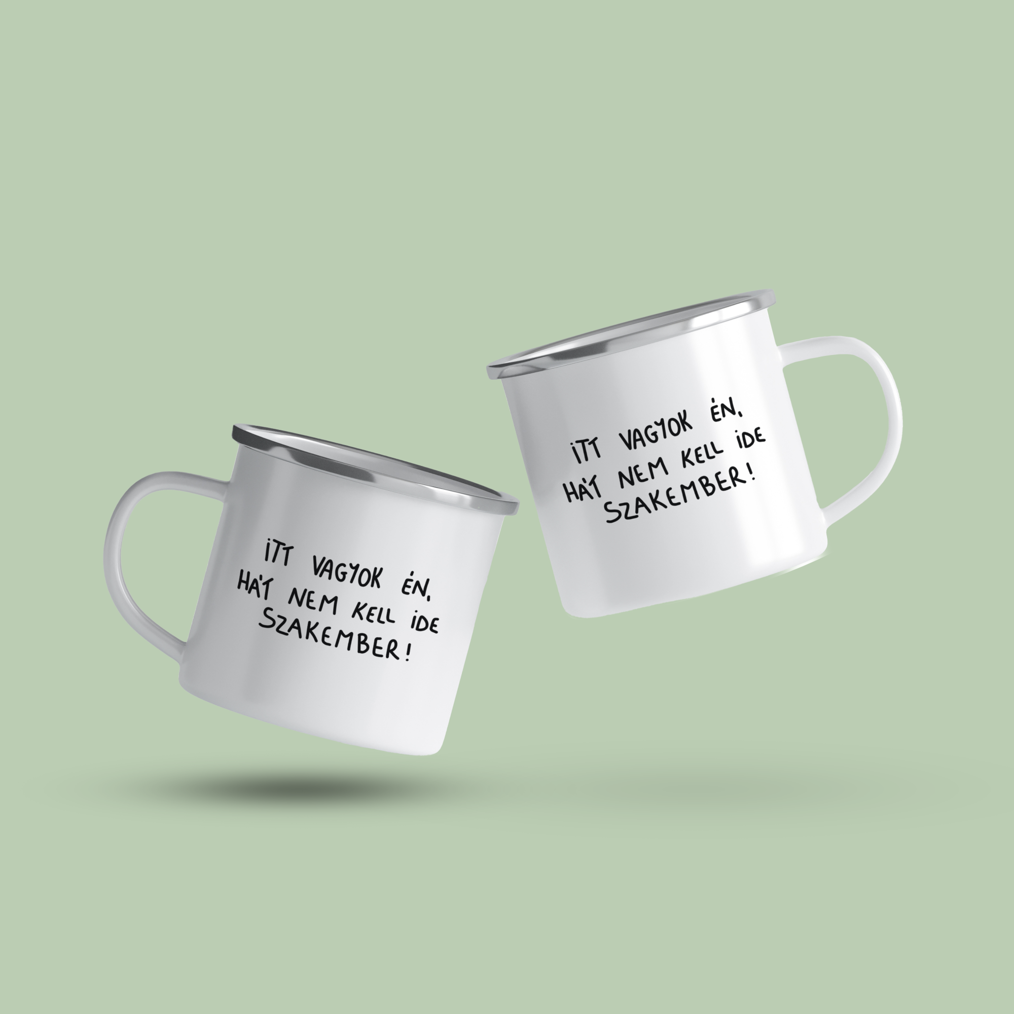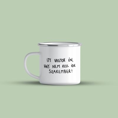Cană emailată „Nem kell ide szakember”, alb, ibrik, 360 ml
