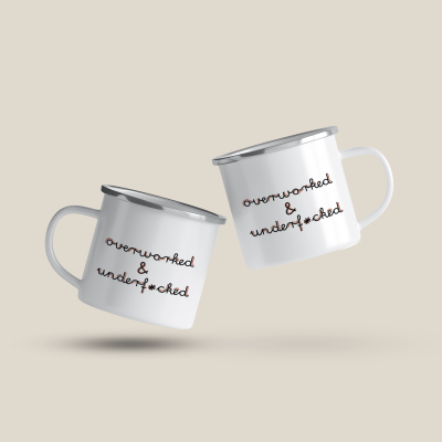 Cană emailată Overworked & underf_cked, alb, ibrik, 360 ml