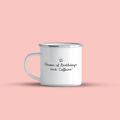 Cană emailată „Queen of birthdays” BW, alb, ibrik, 360 ml
