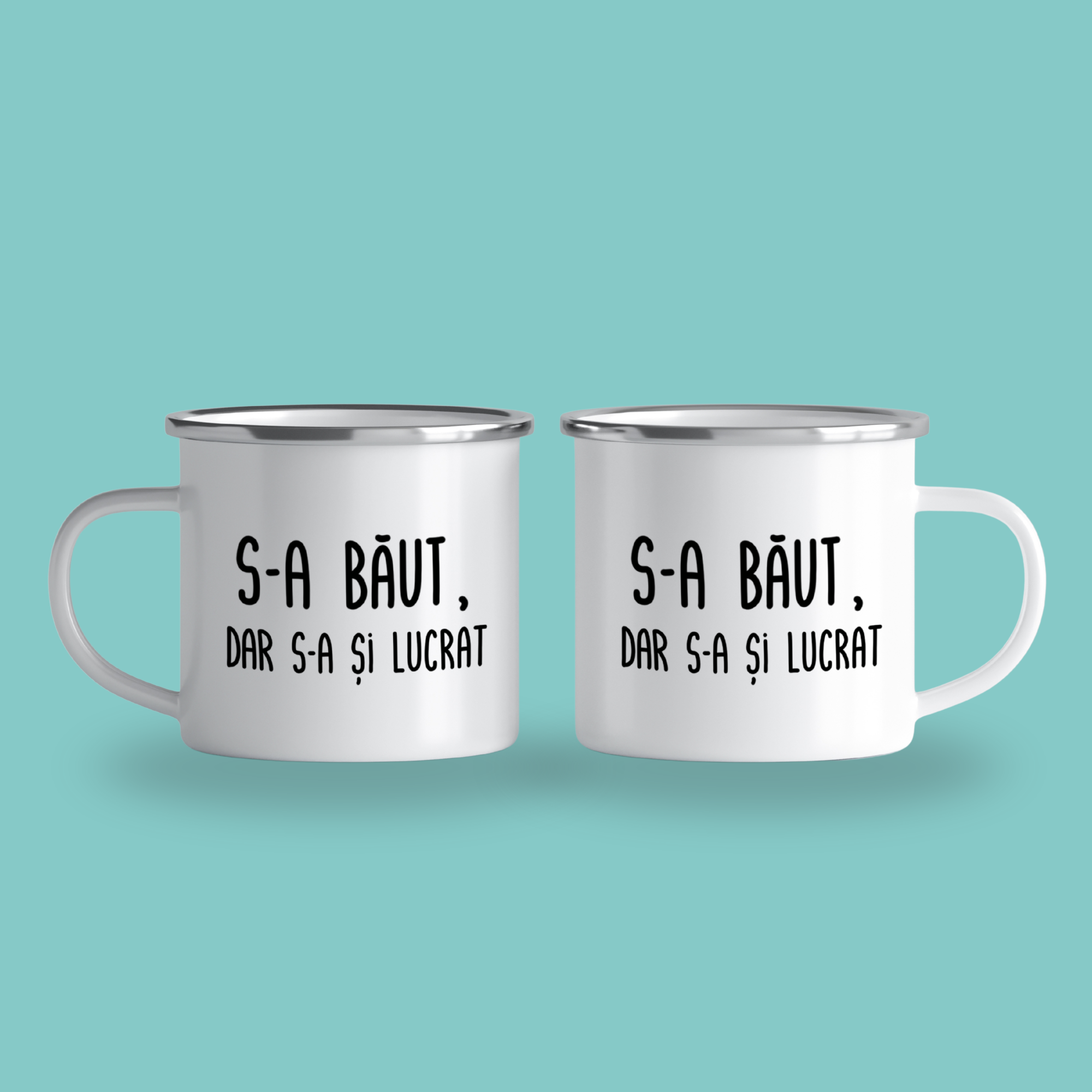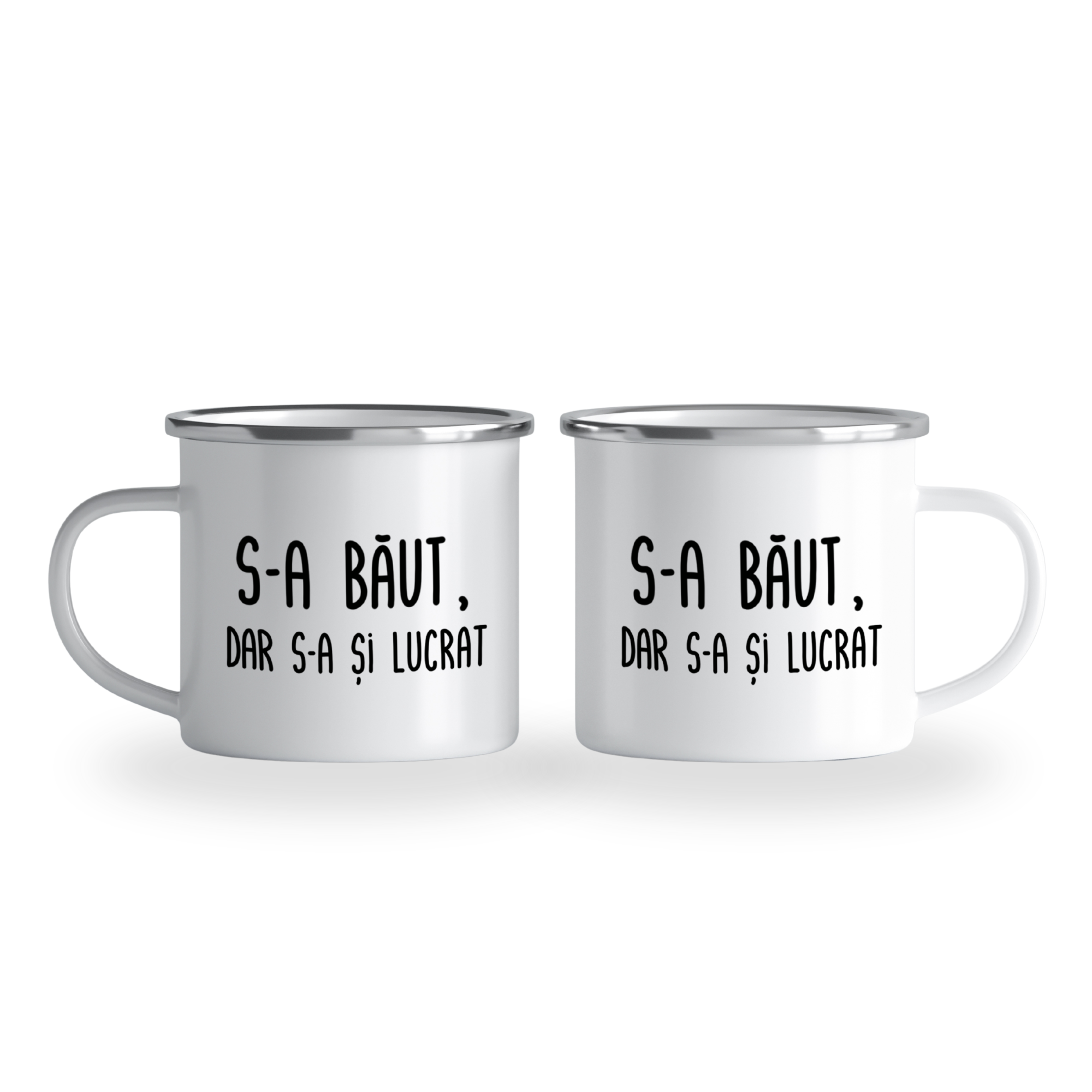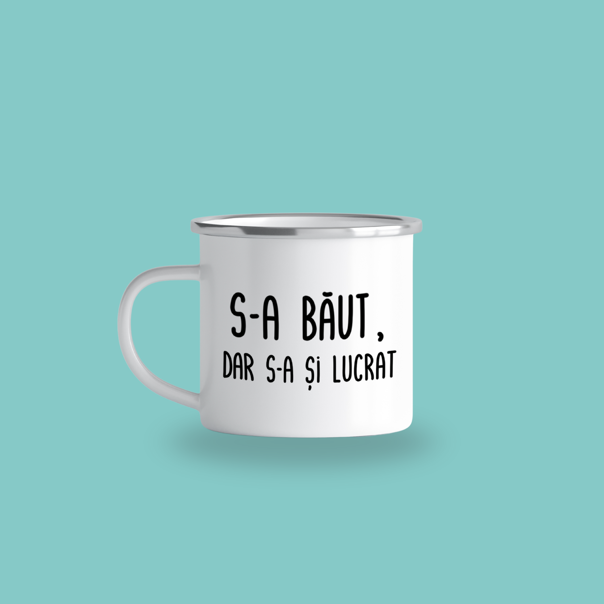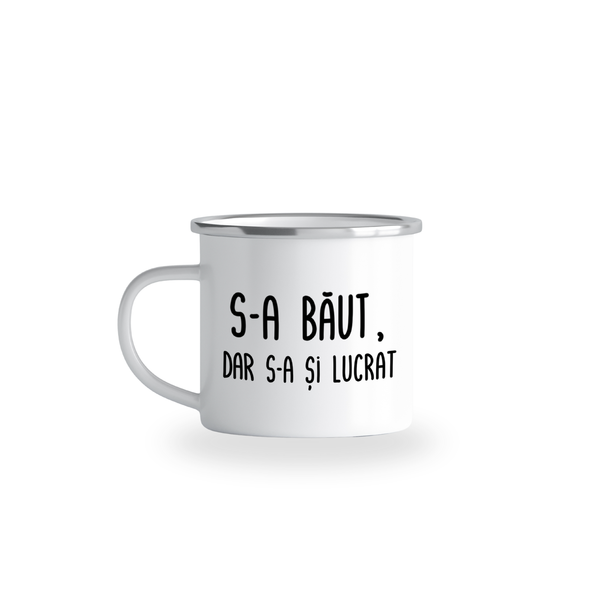 Cană emailată „S-a băut, dar s-a și lucrat”, alb, ibrik, 360 ml