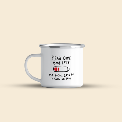 Cană emailată Social battery running low, alb, ibrik, 360 ml