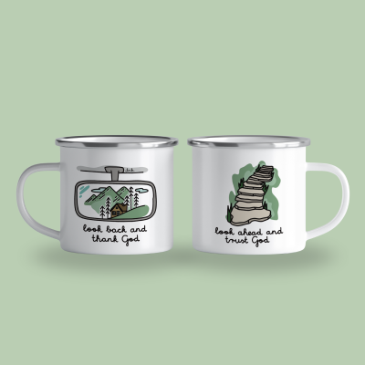 Cană emailată „thank God // trust God”, alb, ibrik, 360 ml