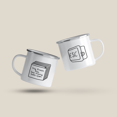 Cană emailată Too many tabs open, alb, ibrik, 360 ml