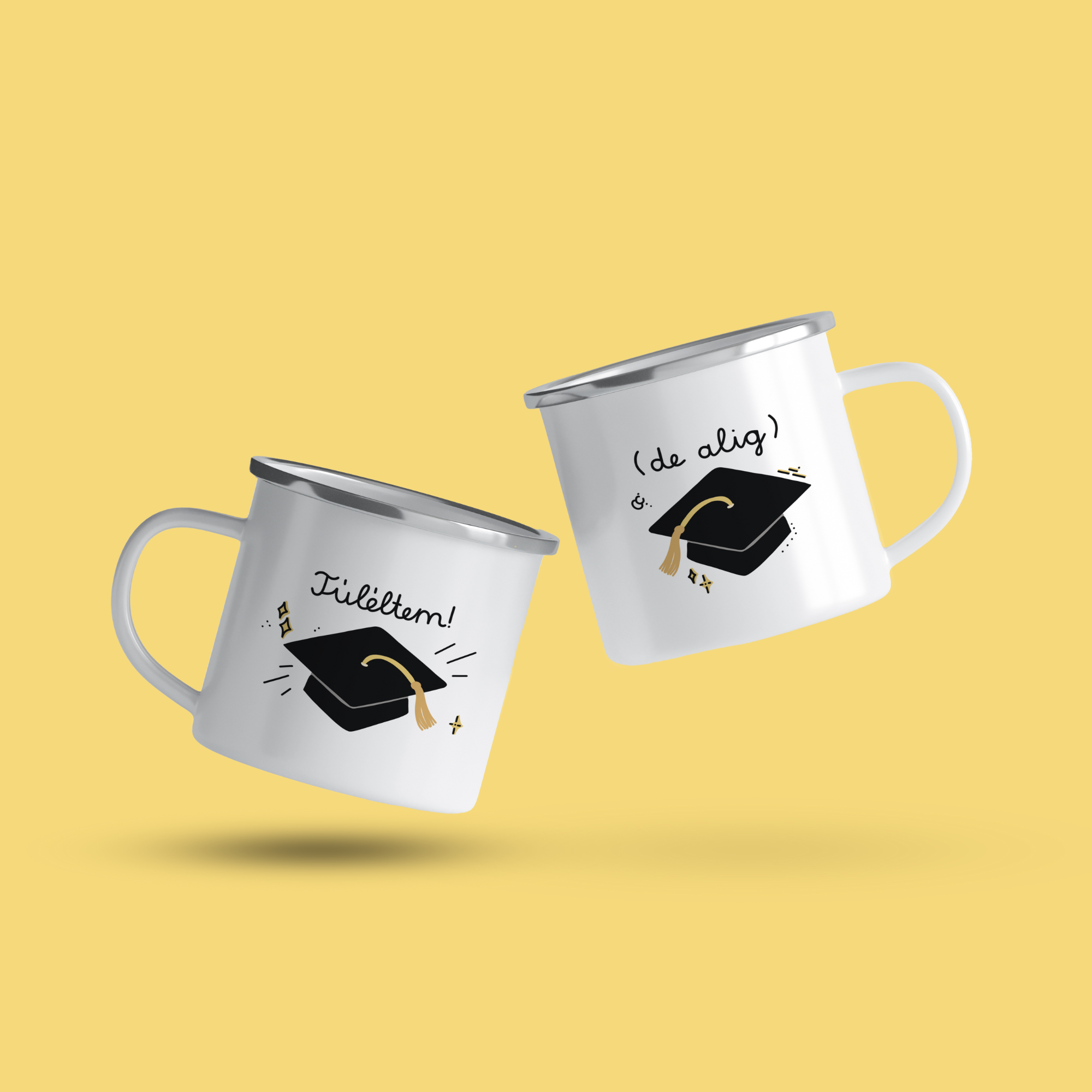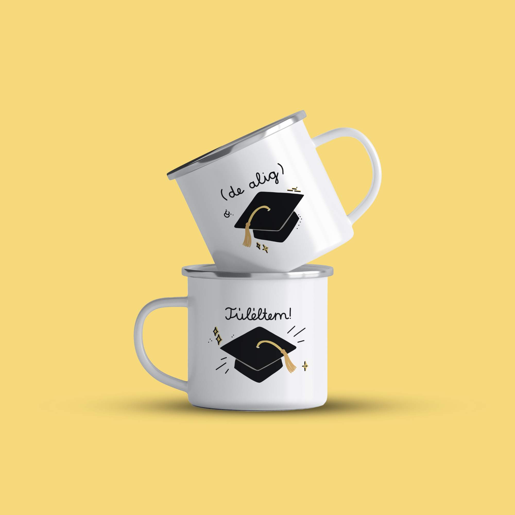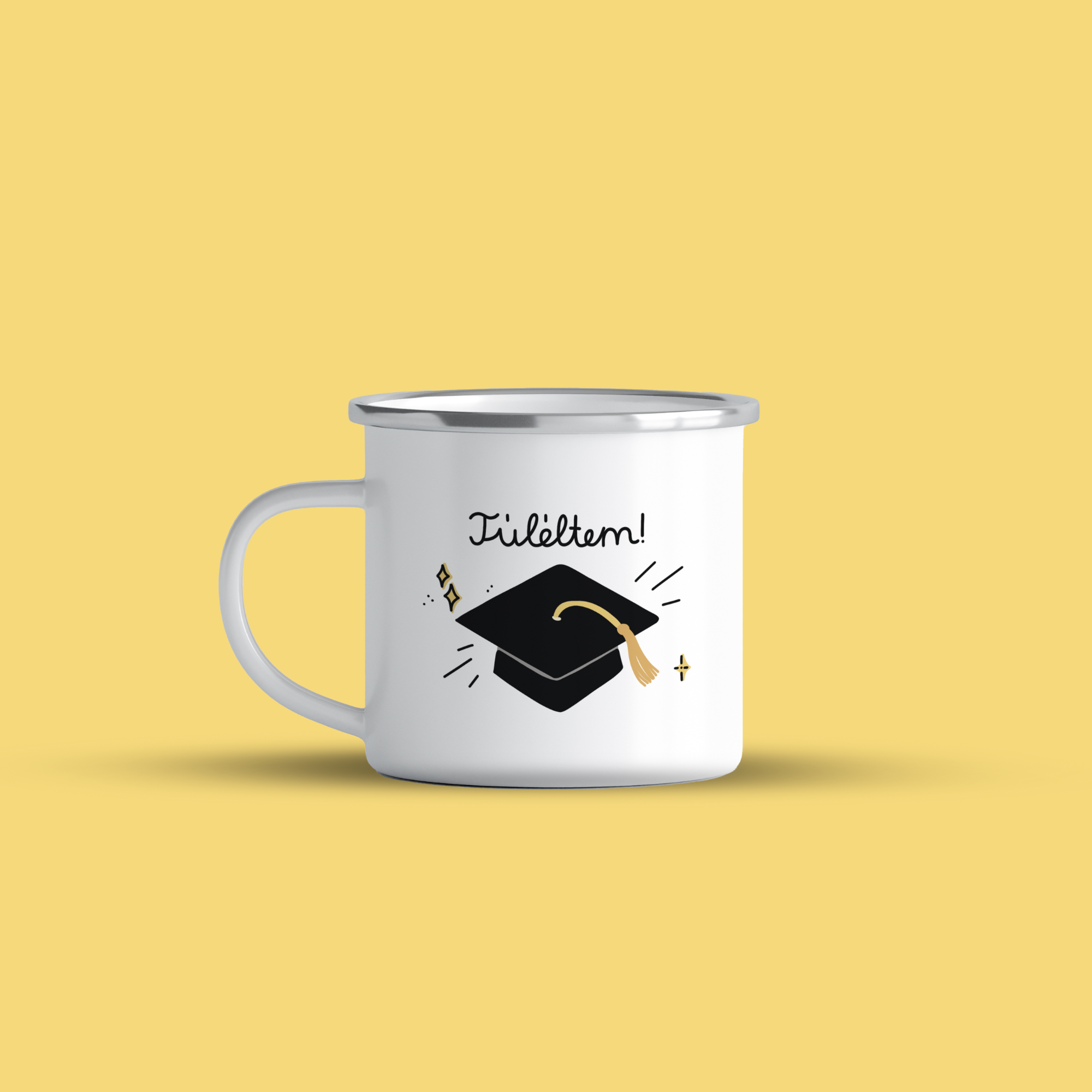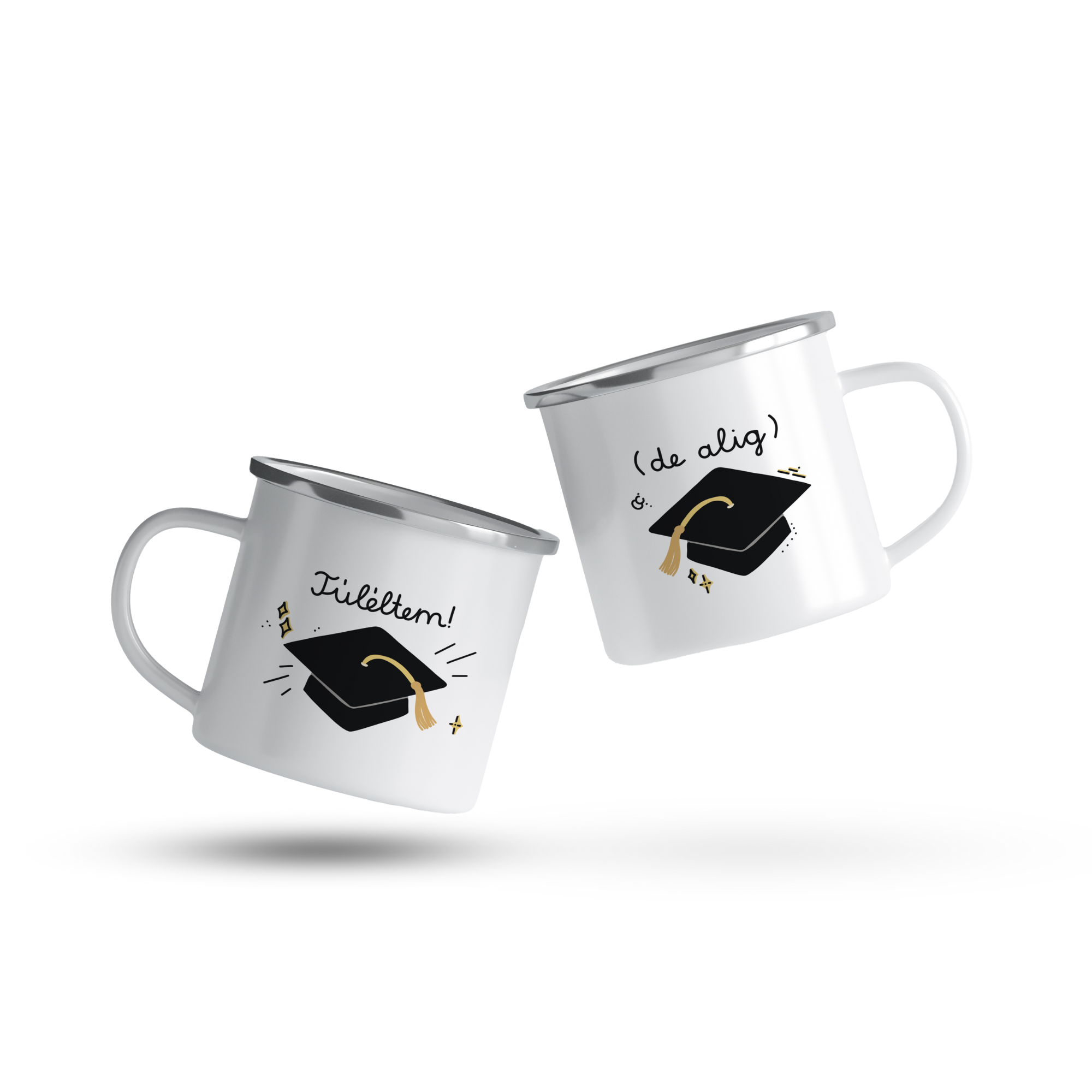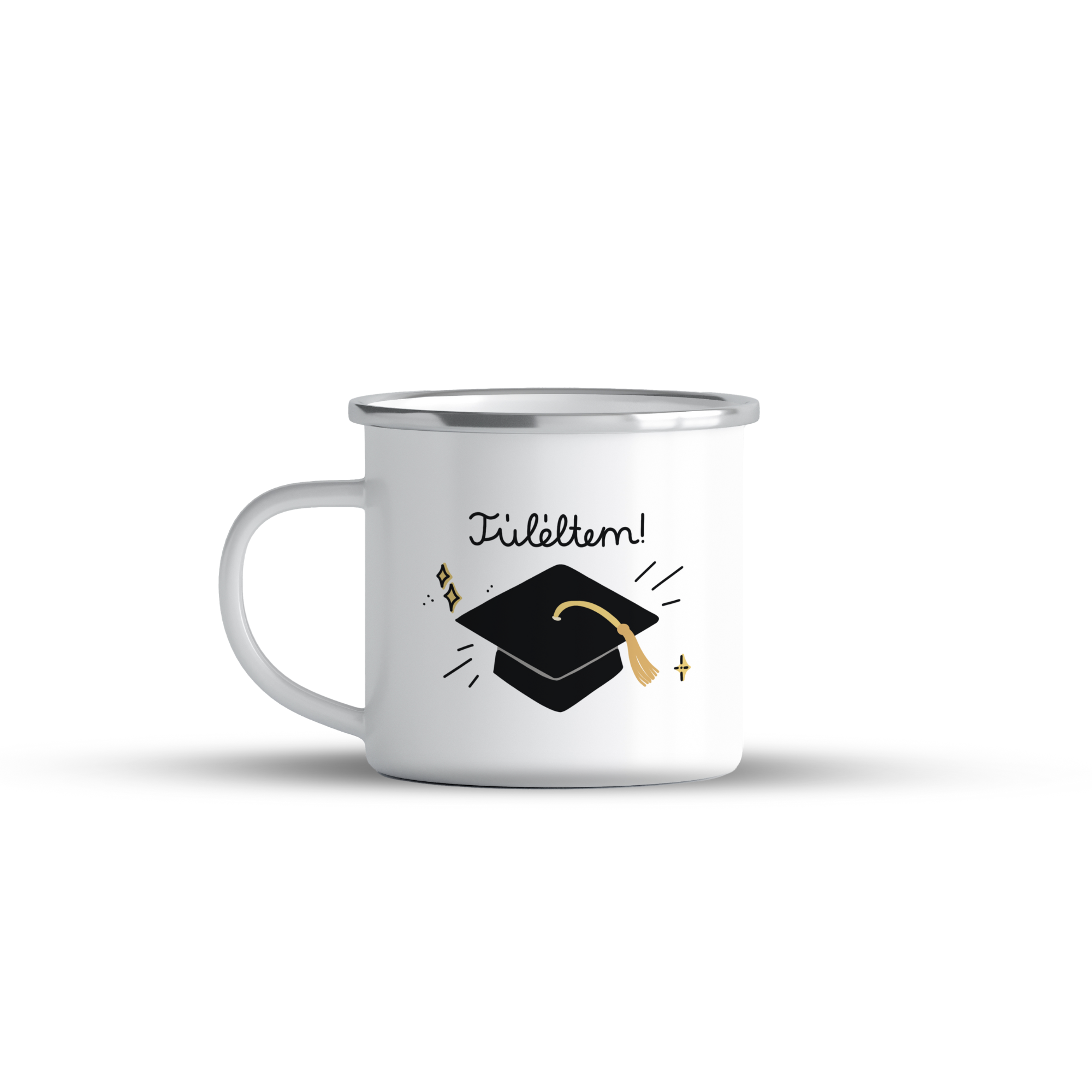 Cană emailată „Túléltem – de alig”, alb, ibrik, 360 ml