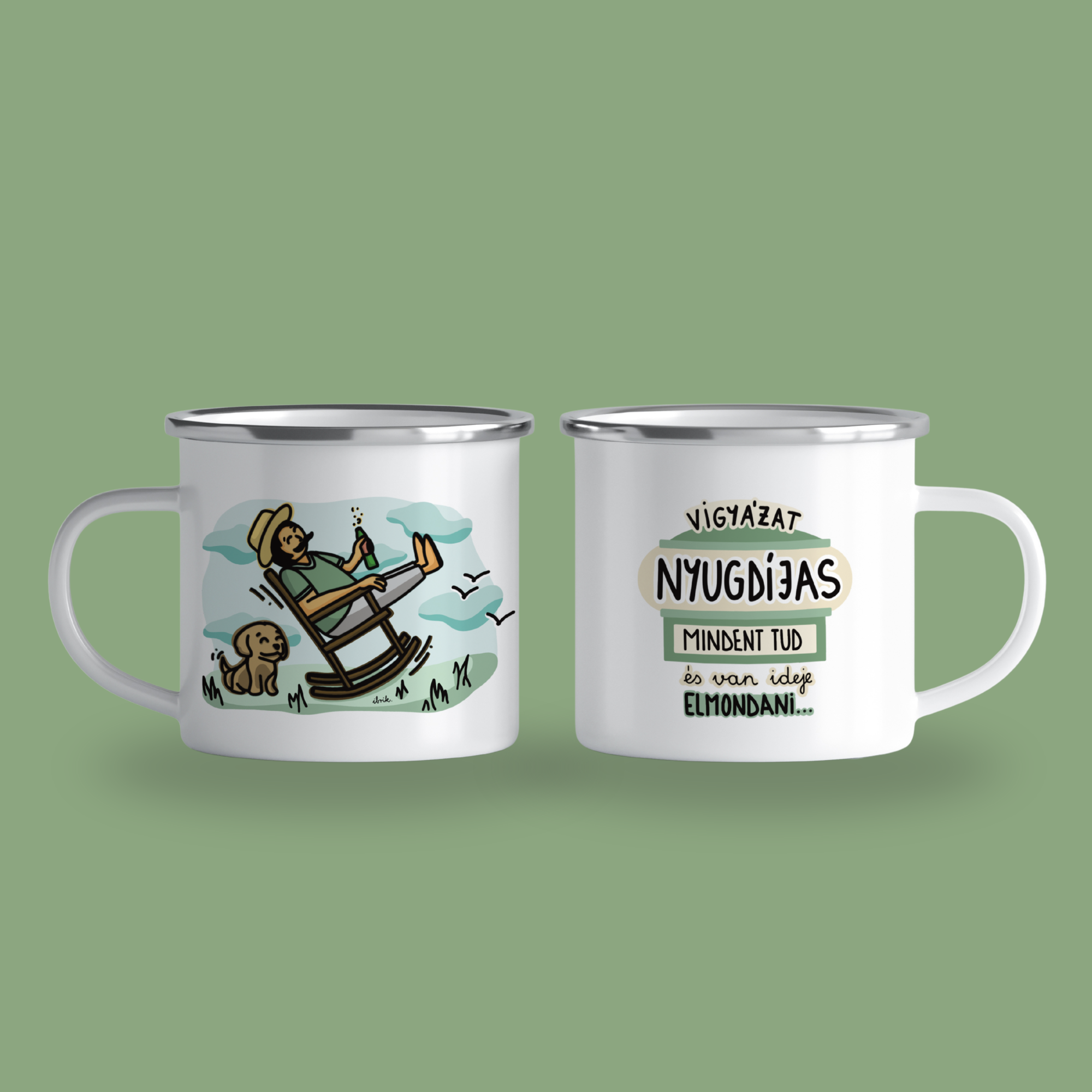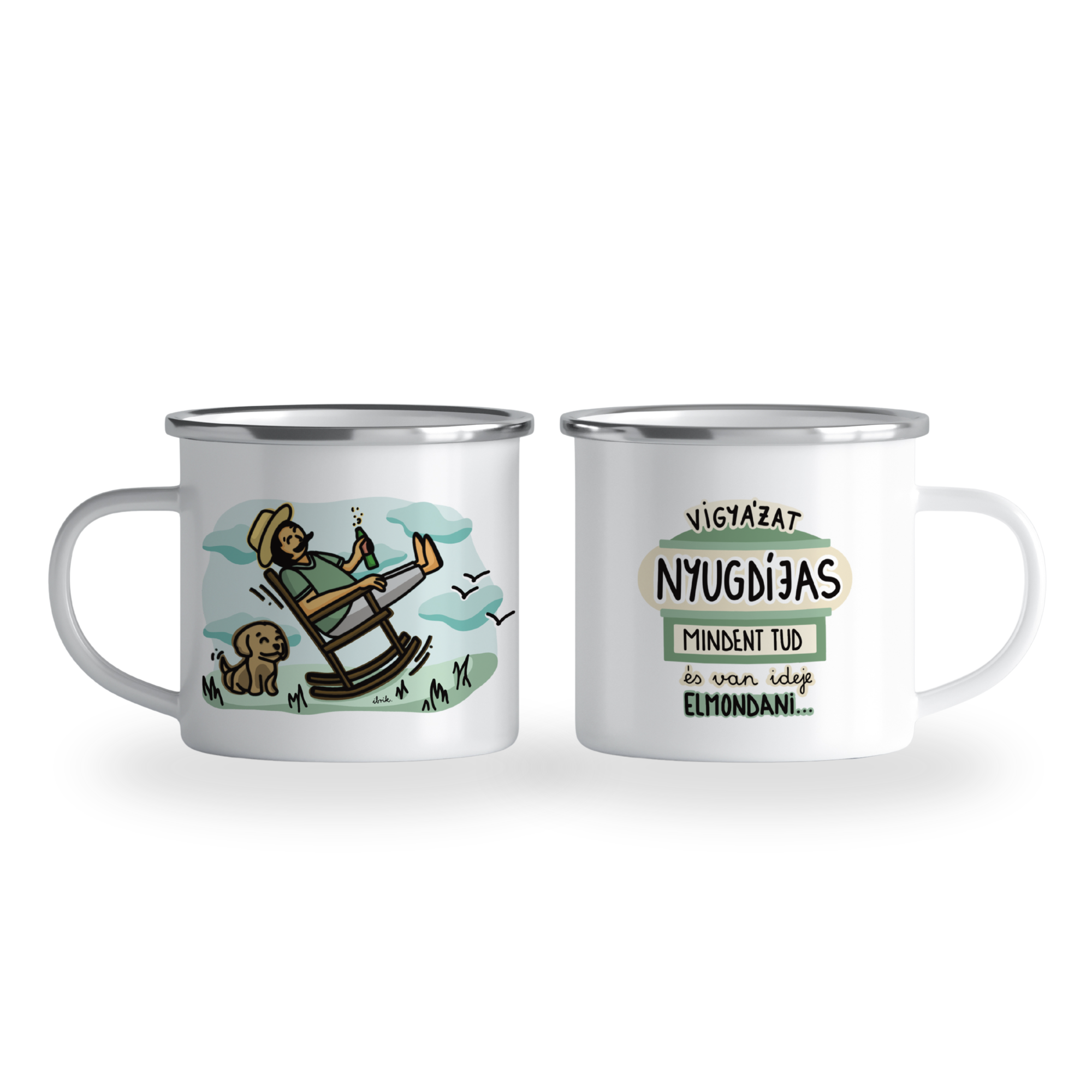 Cană emailată „Vigyázat, nyugdíjas” – férfi, alb, ibrik, 360 ml
