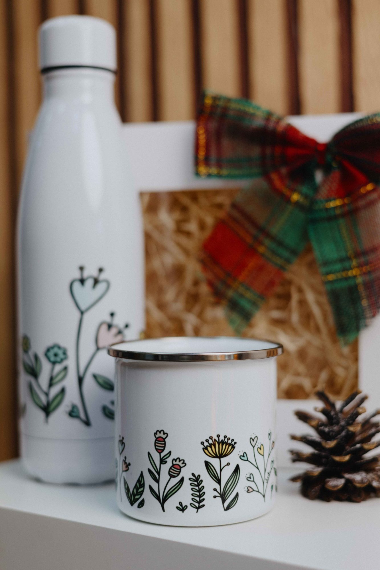Cana emailată de 360 ml, cu grafică unică desenată manual.