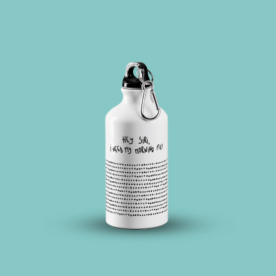 Sticlă de apă din aluminiu Hey Siri – morning fix, tip MAKALU, alb, 500 ml